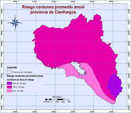 En el caso de los riesgos ceráuneos, es necesario conocer cómo se comparta estos fenómenos en el territorio seleccionado. El riesgo de impactos de tormentas eléctricas va a estar influenciado por las características típicas del clima tropical cubano, pudiendo ocurrir durante todo el año y en cualquier hora del día, no obstante, durante el periodo lluvioso (153 días, de junio a octubre) este riesgo es más elevado. En la figura 9, se pueden apreciar el mapa del riesgo ceráuneo en el periodo lluvioso.