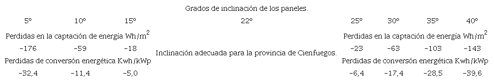 La energía captada por el receptor está en dependencia entre otros factores, de la inclinación del mismo respecto a los rayos solares; se recomienda que la mayor captación de la radiación durante el año para sistemas fijos se obtenga con una orientación de la superficie captadora de los módulos hacia el sur, con una inclinación acimutal 0 y un ángulo de inclinación igual a la latitud del sitio de instalación, ello favorece la máxima captación promedio en el año. Las simulaciones realizadas han permitido calcular la eficiencia de captación de las celdas fotovoltaicas, en diferentes ángulos de inclinación de los paneles, según se muestra en la tabla 2.