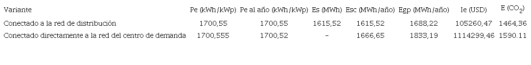La energía solar es la más distribuida, predecible y estable de las fuentes renovables, no siendo necesaria su distribución ni trasportación para ser suministrada y consumida. El suministro directo a los centros de demanda de la energía eléctrica generada con CFV, puede representar en unos casos una relación de ahorro de 1,5 kWh generado con petróleo, por cada kWh consumido de fotovoltaica y en otros casos la relación del ahorro de energía generada con petróleo puede llegar a 1,16 kWh, por cada kWh de fotovoltaica consumido. En la tabla 3, se muestran los resultados de la simulación de dos centrales FV conectadas a la red, en un sitio donde incide una radiación solar similar al de Cantarrana. La primera conectada a la red, estimándose las pérdidas promedias del 5 % asociada a los procesos de distribución y transportación, así como un 5 % vinculada a energía generada y no entregada por fallos de la red; la segunda conectada directamente a la carga del centro de demanda y partiendo de que en ningún sistema eléctrico las perdidas llegan a ser iguales a 0, se prevén mermas energéticas del 2 %. Haciendo un análisis mediante las ecuaciones (1), (2) y (3), se obtuvo los resultados mostrados en la tabla 3, donde pueden apreciar los impactos económicos y medioambientales y donde se tiene que: