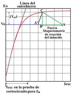 El punto A’ tendrá una ordenada igual a la del punto A menos el valor de la corriente de excitación en la prueba de cortocircuito y una abscisa igual a la tensión nominal de la máquina.