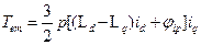 En esta ecuación, p es el número de pares de polos, Ld y Lq las inductancias de eje directo y transversal y (ip el flujo de los imanes.