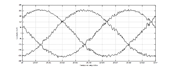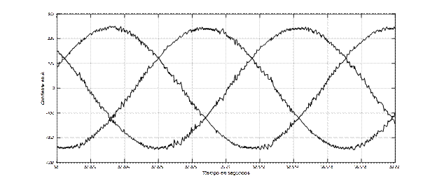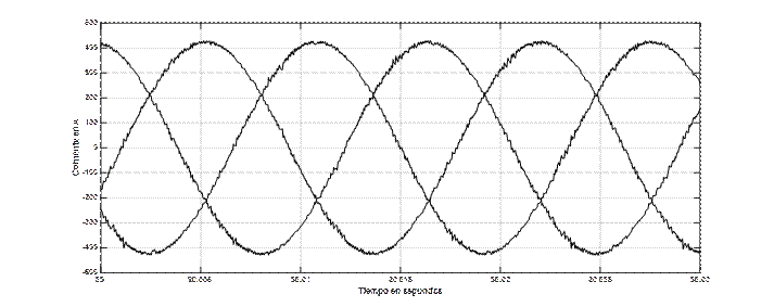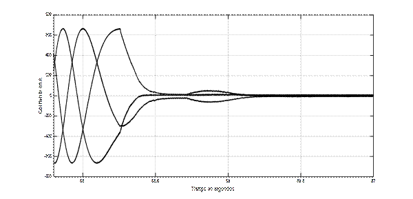 Es interesante observar la figura 19, en la que puede apreciarse que la frecuencia de la corriente por las tres fases va disminyendo rápidamente con el objetivo de disminuir la velocidad.