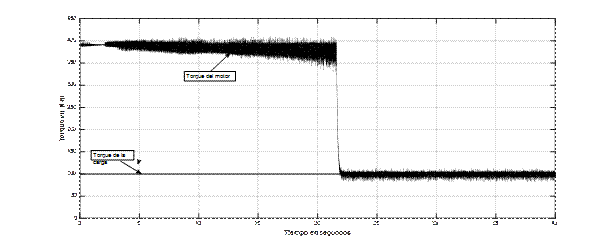 Rápidamente se alcanza una velocidad estable debido a la aplicación de un torque motor mucho mayor que el de la carga y una corriente también elevada. Esta velocidad se mantiene casi constante a pesar de la subida de la pendiente. Esto se debe a la operación del sistema de control a lazo cerrado. Se observa un aumento grande del torque motor al comenzar a subir la pendiente ya que ha aumentado el torque de la carga. Esto es lo que mantiene la velocidad prácticamente constante.