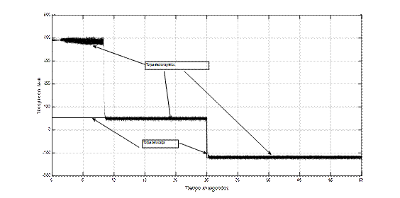 Como puede apreciarse en la figura 19, la orden de detención está dada mediante una señal en rampa descendente que provoca la aparición de un torque contrario a la rotación provocando un frenado regenerativo que provoca la detención del vehículo entregando energía para cargar la batería a expensas de la energíe cinética de las masas rotatorias (ver figura 20).