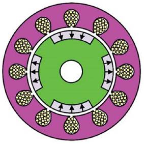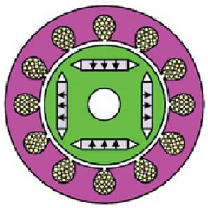 En dependencia de la ubicación de los imanes en el rotor existen dos tipos de motores de imán permanente, los de montaje superficial, llamados a veces erróneamente, motores de CD sin escobillas [6], en los cuales los imanes van montados en la superficie del rotor y los de imán permanente interior, los cuales son de dos tipos: de montaje superficial interno tal como se muestra en la figura 3, y de montaje radial externo, como se muestra en la figura 4. Desde el punto de vista de su modelo, control y características de operación son muy similares y son denominados de Imán Permanente Interior.