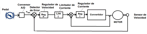 En la figura 5, se muestra el diagrama de bloques del sistema de control de un VE de forma muy general y resumida. El pedal y el conversor A/D son los elementos de entrada que introducen el comando o referencia. Mediante más o menos presión en el pedal el sistema recibe una señal proporcional a la velocidad deseada en el carro. La señal del pedal es analógica y puede estar entre 0 y 10 V o entre 4 mA y 20 mA. Debido a que el control del carro es digital, es necesario un conversor análogo digital.