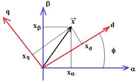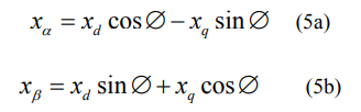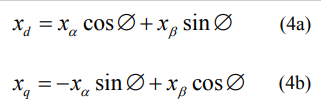 Se hace entonces la denominada Transformación de Park Gorev que consiste en llevar las ecuaciones de la máquina en los ejes αβo a un sistema de coordenadas que gira con el rotor a la velocidad sincrónica con un eje directo d y un eje transversal q. Las ecuaciones de transformación son [2, 3, 4]. Vea ecuaciones (4a) y (4b).