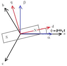 Como en toda máquina de polos salientes, en este motor la inductancia que “ve” el campo magnético del estator depende de la posición del rotor [3]. Por eso se define y se plantean las ecuaciones en otro sistema de coordenadas cuyo eje real coincide con el del polo y cuyo imaginario está 90o en adelanto tal como puede apreciarse en las figuras 7 y 6.