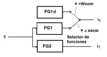 Como puede apreciarse, el mismo torque puede conseguirse con muchas combinaciones de componentes de corriente ix e iy, se selecciona entonces aquella que da lugar a la menor corriente de armadura. Esto aumenta la eficiencia y la utilización del motor y el accionamiento en general. El selector de flujo toma la forma que aparece en la figura 8, donde FG1 y FG2 son las funciones que se utilizan para el control MTPA.