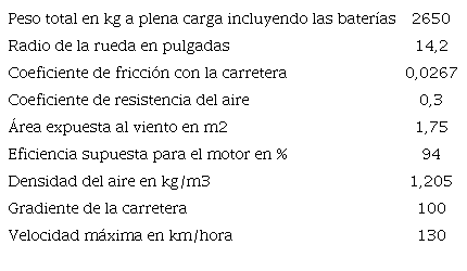 Se seleccionó el carro cuyos datos aparecen en la tabla 1, accionado por el motor con los datos de la tabla 2.