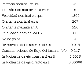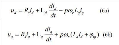 Donde RS es la resistencia del enrollado del estator por fase, Ld la inductancia de eje directo, Lq la inductancia de eje transversal o en cuadratura, ωr la velocidad del rotor en radianes por segundo, φip el flujo por polo de los imanes en weber, p el número de pares de polos, ud y uq las tensiones de eje directo y transversal e id y iq las corrientes de eje directo y transversal.