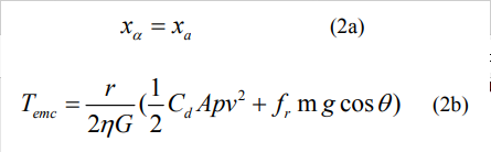 En esta ecuación (11), r es el radio equivalente de las ruedas, donde Cd es el coeficiente de resistencia aerodinámica, A es la superficie frontal del vehículo, p es la densidad del aire, v la velocidad lineal del vehículo, fr es el coeficiente de rozamiento con el suelo, m la masa total del carro, η el rendimiento mecánico de la transmisión, g la aceleración de la gravedad ,θ la pendiente de la carretera y G la relación de transmisión.
