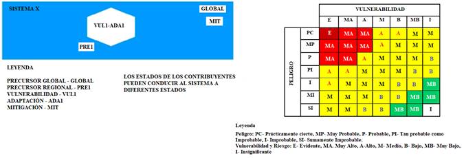 Es imprescindible aclarar, que el sistema diseñado para estos estudios parte del reconocimiento de los postulados sobre el calentamiento global emitidos por el PICC. El estudio de riesgo objetivo asociado al cambio climático impone el reto de incluir todos los factores influyentes en el riesgo climático global en una ecuación de riesgo. El patrón conceptual sistémico de riesgo global consiste en representar, esquemáticamente (ver figura 3 izquierda), que cualquier sistema (SISTEMA X) tendrá peligros (PRE1) asociados (huracanes, nivel del mar, deshielos, sequías, inundaciones, otros), a los cuales corresponden vulnerabilidades (VUL1) y posibles medidas de adaptación (ADA1 - compensatorias de las vulnerabilidades), ambas adaptadas a los peligros. Este sistema está afectado por variables globales (naturales y antropogénicas), en las que las segundas (GLOBAL) pueden ser compensadas con medidas de mitigación (MIT). El comportamiento de estas variables provocará diferentes niveles de riesgo para el sistema.