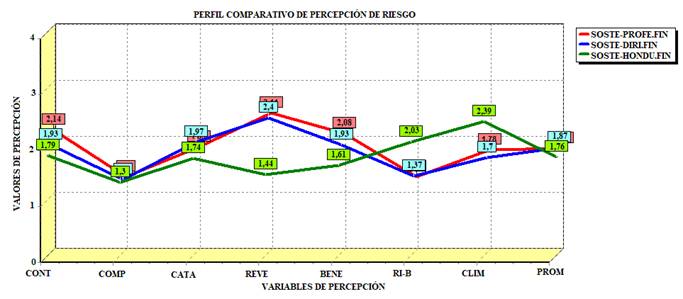 La figura 5 muestra los perfiles de riesgo percibido, obtenidos para dirigentes y profesores de la red de escuelas asociadas a la UNESCO en Cuba, así como el obtenido para el caso de las universidades hondureñas. En el eje de las abscisas de la gráfica aparecen las variables de percepción evaluadas para cada grupo investigado, mientras que el eje de las ordenadas, los valores Score de percepción de riesgo a nivel de grupo para cada variable. En el extremo derecho se ilustra el valor de Score grupal. Las líneas quebradas permiten la valoración comparativa del riesgo percibido entre los grupos evaluados.