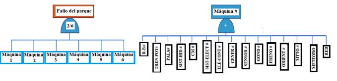 El árbol de fallos empleado para modelar los parques se presenta en la figura 7. La posibilidad de representar todos los parques con el mismo árbol de fallos radica en la similitud de cantidad de máquinas (6), de cada parque y en el ajuste, ya explicado, de todas las tecnologías a un aerogenerador genérico. La aproximación considerada para evaluar la disponibilidad del parque es que se admite sólo una máquina fuera de servicio (lógica 2 de 6). El subárbol desarrollado en la parte derecha de la figura es adaptable a cualquiera las máquinas del subárbol izquierdo, sustituyendo el carácter # por el número de máquina modelada [7].
