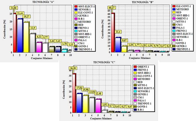 Tras los estudios de confiabilidad de los emplazamientos, los resultados para los principales contribuyentes reflejan la importancia de los eventos meteorológicos extremos y de los fallos de la red en cualquiera de los casos. Considerando que tales contribuciones son ajenas a las tecnologías, se realizó un estudio más detallado de cada máquina según su tecnología. Las distribuciones de fallos para las tres tecnologías se muestran en la figura 8.