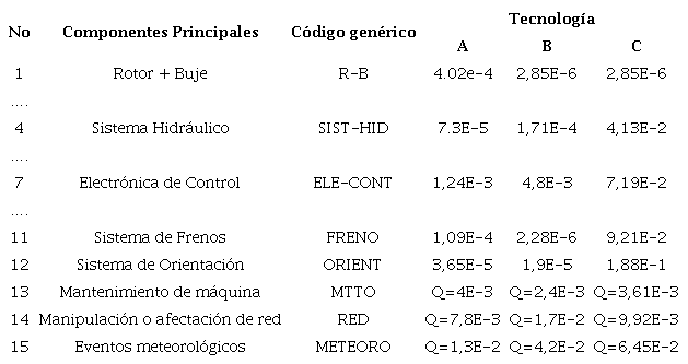 En el momento del estudio, coexistían en Cuba tres tecnologías eólicas (A, B y C). La tabla 1, resume el esfuerzo realizado, tras el procesamiento de decenas de miles de registros de cada parque, almacenados en los sistemas SCADA de los emplazamientos. El código genérico de cada componente reflejado en la columna 3 de la tabla 1, corresponde a los sucesos ilustrados en el árbol de fallos de la figura 7 (parte derecha).
