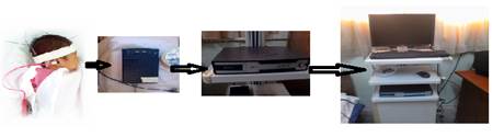 El equipo AUDIX de la firma NEURONIC, es un electroaudiómetro computarizado para una exploración exhaustiva de la audición y la visión, que se basa en el registro de potenciales evocados auditivos o visuales de estado estable (PEAee). Esta técnica permite realizar una exploración audiométrica detallada por frecuencias mostrando los resultados en forma de un audiograma convencional. Los PEAee son respuestas que no se afectan por la sedación ni el sueño lo que las hace ideales para la exploración de la audición en niños pequeños, incluso de recién nacidos. El equipo cuenta con un preamplificador y un amplificador incorporado mediante cableado y un sistema de adquisición de señales por audífonos conectado por cables al mismo, como se muestra en la figura 1.