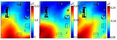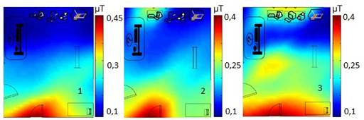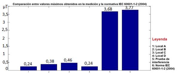 No obstante a la existencia de interferencia en el área, los mayores valores medidos en cada cubículo, no sobrepasan el normado por la IEC para ambiente de trabajo de equipos médicos, pero a pesar de ello se debe mantener la vigilancia sobre el máximo valor obtenido, pues fue de 3,68µT y el valor normado por la IEC es de aproximadamente 3,77µT [14] , como se muestra en la gráfica de la figura 13.