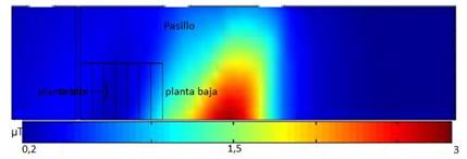 Adicionalmente se tomaron los valores en el pasillo que da acceso al departamento, dichos valores se ilustran en la figura 9, representando a su vez junto al mapa de colores su correspondiente escala en µT.