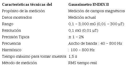 Para la medición del campo electromagnético se utilizará un gaussímetro marca EMDEX II cuyas características se muestran en la tabla 1, [12].