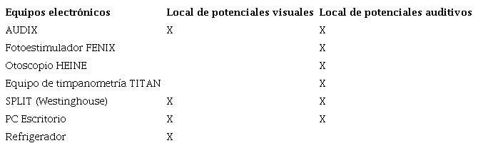 Se utilizarán además los equipos médicos con que cuenta la sala de neurofisiología en estudio, los que se relacionan en la tabla 2. En este caso el estudio estará orientado hacia definir si existe interferencia sobre el equipo diagnóstico de potenciales evocados auditivos y visuales AUDIX, por ser el de mayor uso y el que se utiliza para diagnosticar las afecciones a los bebés.