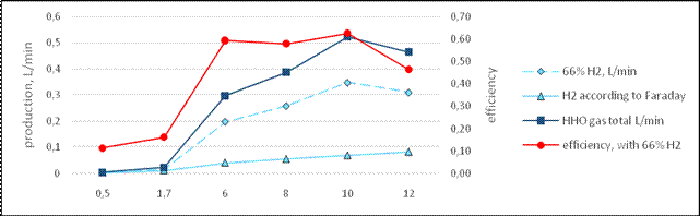 The electrolytic cell work with water and an electrolyte. The electrolyte recommended is KOH, but may be NaCl, or other. The cell produces hydrogen as function of current, and current depends of KOH concentration (with a voltage fixed by 12 V battery). Detailed information about this cell is in [16]. Efficiency η is on energy basis, according to Faraday, as: equations (1).