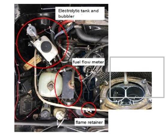 The line of HHO gas to engine has a bubbler, to retain some water and particulates of electrolyte, and a flame retainer. In the car body, the cell should be in a well-ventilated place, in a supportwith enough stiffness to avoid damage because of vibration, and where all hose connectionsare easy to assemble and check. Inside the engine compartment, below cover, are the rest of components: water tank, bubbler, flame retainer and hoses. Also is the flow meter, between gasoline tank and fuel pump.