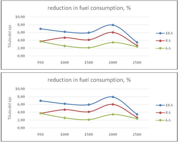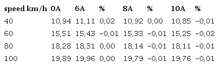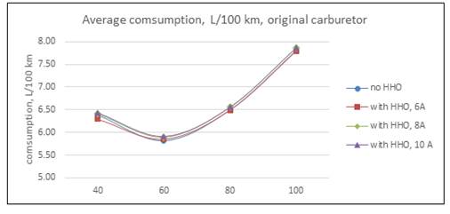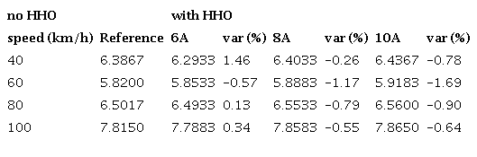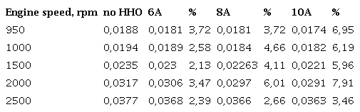 As was said, in the first round of experiments the car usedits standard carburetor. Results withdifferent cell currents are in Table 1 and Fig 3. HHO production in each case are 0,297 l/min with 6 A; 0,387 l/min with 8 A and 0,522 l/min with 10 A. Is necessary to point out that the bigger the current, the bigger the electrical load imposed to engine alternator.