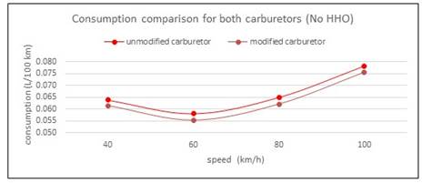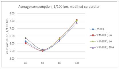 This result take place because as long as the cell current decreases, the power taken from the engine is less important, and the effect of HHO is more visible. When the current cell increases, the HHO has no effect, because the extra power demanded by the cell from alternator comes from gasoline and speed engine reduce slightly, consequently the air-fuel charge is also reduced. Therefore, the effect of the electrolytic cell is negative. In the second round of test with modified carburetor, results are shown in Table 2 and Fig 4. First, notice the consumption reduction respect to original carburetor (second column in Table 1 and Table 2.Now, the hydrogen added has a positive effect in 40 km/h with 6A and in 100 km/h with 8 and 10 A, being the last the bigger. The same facts signaled in the former paragraph are present. In the first case, this is because the low energy demanded by the cell with a current of 6 A. At high speed, the engine should run faster, the valves have less time to open and close, and as a result, the volumetric efficiency decreases slightly. Nevertheless, HHO gas contains an amount of oxygen, and this, together with Hydrogen contributes to a good combustion process. These results are in line with [12]. In Table 1, is also visible the trend to a minor increment in fuel consumption at 100 km/h, even with the cell at 10 A. Is very interesting to compare consumptions between carburetors. All cell manufactures recommend to reduce the diameter of jet fuel valves, because with HHO it will not be necessary the same gasoline flow. In the Fig. 6, is easily visible the positive effect of this reduction, with a fuel saving of 3,81% as average. Moreover, after modification there was no perceptible variation in vehicle dynamic. This open the question about the facts argued by manufacturers respect to fuel savings in carburetor engines are true, or are because the modifications in carburetor and way of driving.