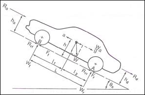 In Fig 7, the movement is from right to left, climbing a slope with angle θ. This forces are in the longitudinal direction, the aerodynamic resistance Ra, rolling resistance in front and rear tires Rrf, and Rrr, drawbar load Rd, gravity resistance Rg, (W sin θ,), and tractive forces of the front and rear tires Ff andFr,. For a rear-wheel-drive vehicle, Ff, = 0, whereas for a front-wheel vehicle,Fr, = 0. In a 4-wheels driven vehicle, both have value. In vertical directions are Wf and Wr, road reactions in front and rear axles, dependents of weight distribution. In the figure are some dimensions necessary for calculus.