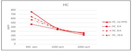 However, the cell efficiency is included in the process, so this does not represent a real saving when the cell is fed by the own engine.The analysis of escape gas composition made at 950, 1500 and 2000 rpm shows a reduction in CO and unburned HC in all regimes figure 8 and figure 9. The reduction in CO is almost the same for all speed, because the more efficient combustion in presence of HHO. Regarding unburned HC, is more significant in 950 rpm, when the mix is leaner. At this speed are more possible fails in gasoline ignition, but the ignition energy of hydrogen is about 10% of gasoline, and ignite more easily, burning the remainder of gas in cylinder. This result underline the positive effect of hydrogen in burning a lean mixture of gasoline and air.