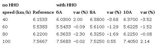 Two traffic signals at 1 km each to the other marked the test length. Each test was repeated three times in each direction. Before launching experiments, the car was inspected, including tires, oil level, steering system, brake system, cooling system, carburetor, etc., and at the very beginning of each travel, tires pressure was checked and corrected if necessary. In the first round of experiments, hydrogen did not produce any perceptible saving in fuel consumption. Following cell manufacturer recommendations, fuel jet diameter valves were then changed from 1, 12 to 1,07 in the primary chamber, and 1,50 to1,3 mm in the secondary chamber respectively for a second round. The car speed was 40, 60, 80 and 100 km/h. For 40 km/h the car was in 4th speed (direct 1:1), for the rest used the 5th (0,82 transmission relation, or multiplication).The fuel consumption meter is a Flowtronic 206,this device has a measurement range of 0,5 to 60 l/hour; capacity of 0 to 99,99 liters and precision of ±0,5 %. A third test was the measurement of fuel consumption and gas composition with the cell fed by an external battery and the vehicle stationary with original carburetor. In this test, both radiator fans were disconnected. An external fan simulates the airflow through radiator, assuring a stable water temperature of about 87°C. In this test, the exhaust gas composition is determined using a gas analyzer CAPELEC CAP3200-OPA.