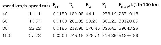 In equations (12), displacement ΔS is 100 km, result are in last column in Table 4. The energy delivered by fuel is: equations (13).