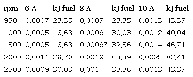 Only at speed of 40 km/h and cell at 6A exist a very low increment in efficiency or positive effect of HHO, and even at 60 km/h there is a decrement. This result shows that the use of an electrolytic cell has no positive effect in a carburetor engine, more; the effect is negative or even null. This result is related with the carburetor function: any light reduction in engine speed (because the alternator applies an extra load feeding the electrolytic cell) reduces airflow and gasoline, and power delivered. The amount of HHO added is not enough to balance the whole process, even despite the better combustion that should occurs when hydrogen is present. The stationary test results are in Table 3 and figures. As can be seen, in all regimes exist an important saving. The higher is for a 10 A current, a logical result taking into account that in regime, the amount of HHO is the greatest and the cell is taking no energy from the engine. The fuel saved represents energy, as can be seen in Table 6.The energy provided by HHO is 0,54 kJ, 0,72 kJ and 0,901 kJ for 6, 8 and 10 A; these values are negligible respect the energy represented by the fuel saved. Is evident that the saving are related for the better combustion in presence of HHO and not because its amount.