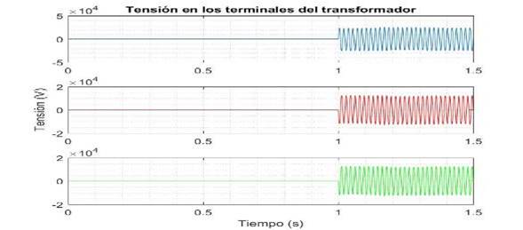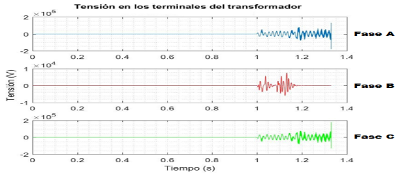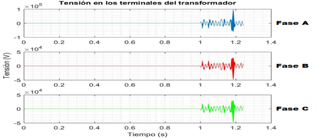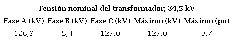 Luego de energizar la fase A (azul), se producen sobretensiones internas en los devanados del transformador que llegan a valores peligrosos por ser muy superiores a la tensión nominal, siendo la mayor de estas; 3,6 p.u. La tabla 1, muestra los valores numéricos obtenidos de la figura 9.