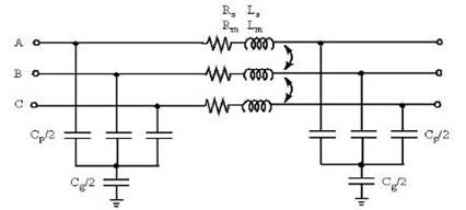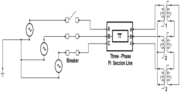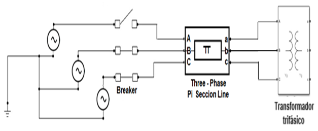 El modelo representa la fuente trifásica de alimentación, un transformador trifásico o banco de transformadores monofásicos, la línea que los une, los interruptores de operación monopolar e instrumentos de medición para conocer los parámetros de entrada y salida. La línea se representa mediante el modelo “PI equivalente”, cuyosparámetros de secuencia cero se calculan a partir de sus características [8, 9]. La figura 4, muestra su representación.