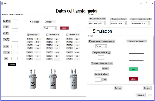 En esta segunda página de la interfaz es posible introducir o modificar los parámetros del transformador, así como de los interruptores. Vea figura 8.