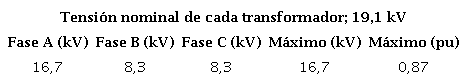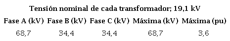 Luego de energizar la fase A (azul), las tensiones que se producen en los devanados de los transformadores, no son peligrosas, ya que la tensión mayor que se verifica es 16,7 kV, es decir, 0,87p.u. La tabla 4, muestra los valores numéricos obtenidos de la figura 11.