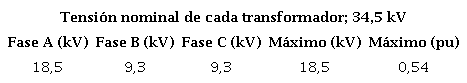 Luego de energizar la fase A (azul), las tensiones que se producen en los devanados de los transformadores, no son peligrosas, ya que la tensión mayor que se verifica es 18,5 kV, es decir, 0,54p.u. La tabla 5, muestra los valores numéricos obtenidos de la figura 12.
