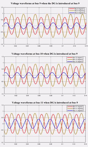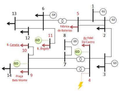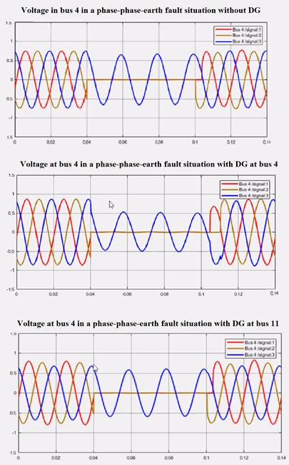 The behavior of the voltage in bus 4 was analyzed for the system in the absence and with the introduction of DG, the latter being positioned in the bus where the fault occurs (bus 4) and, later, in a distant bus (bus 11) of that point.