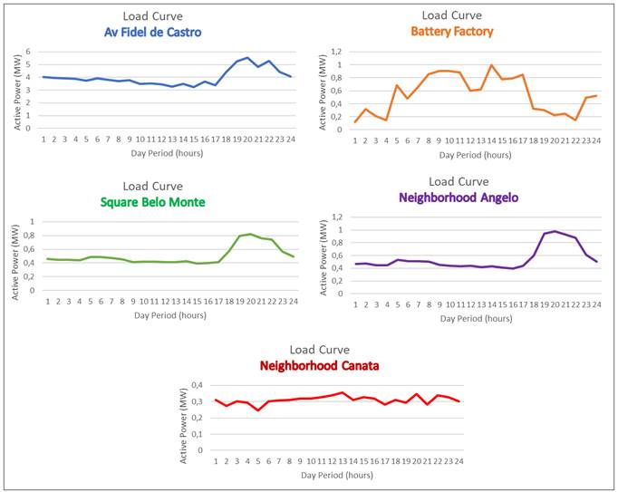 From the graphs, it is possible to observe the distinct profile of the analyzed loads. Av. Fidel de Castro corresponds to the highest consumption, as it is one of the main avenues in the region and serves many consumers. The Battery Factory, as it is an industry, presents peak consumption in the morning and afternoon, with a significant drop during lunchtime and at the end of the day. The Square Belo Monte and the Ângelo neighborhood show similar behavior and demand, with a significant increase in consumption during peak hours, along with Av. Fidel de Castro. Finally, among the load’s understudy, the Canata neighborhood exhibits a balanced behavior throughout the day. According to the concessionary, this neighborhood is characterized by having day and night commerce activities, justifying consumption, even during the night.