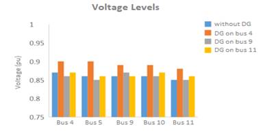 The graph in figure 6, shows qualitatively the behavior of the voltage levels in bus 4, 5, 9, 10, and 11, when there is no insertion of DG and after individually including DG in specific buses.
