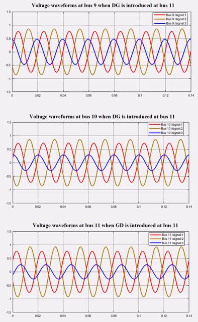 When introducing the DG in bus 9, an imbalance in the voltage waveform was recorded, which was reflected throughout the system, more precisely for bus 9, 10, and 11. Such behavior can be justified by the load profile inserted in bus 9, where Square Belo Monte is located, which presents consumption at the peak time chosen to simulate 0.7946MW. Therefore, much of the power generated by the 6MW DG will be injected into the network, featuring an intense reverse power flow. Because of the bus 9, 10, and 11 are closer to or at the site of the implantation of the DG, these suffered greater impacts on the voltage imbalance, as can be seen in figure 7.