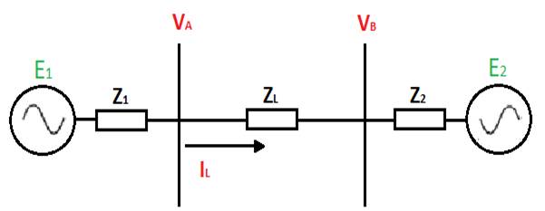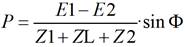 La potencia activa que puede transmitirse entre estos dos sistemas puede describirse utilizando la Fem de las fuentes de los generadores (E1 y E2), el ángulo entre estas (Φ), la impedancia de cada área de generación (Z1 y Z2) y la impedancia de la línea que une las áreas de generación (ZL), en la ecuación (1):
