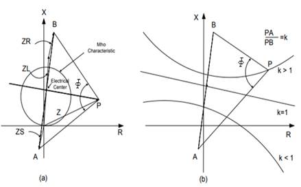 El ángulo entre los dos segmentos que conecta P a los puntos A y B es igual al ángulo Φ. Cuando el ángulo Φ alcanza un valor de 180º, la impedancia es precisamente la ubicación del centro eléctrico. Se puede apreciar que la trayectoria de la impedancia, medida por la protección, puede entrar en la zona 1 de la protección y corresponder con una falla en la línea. En situaciones para las que k ≠1, se puede demostrar que la trayectoria de la impedancia corresponde a círculos (figura 2 (b)).