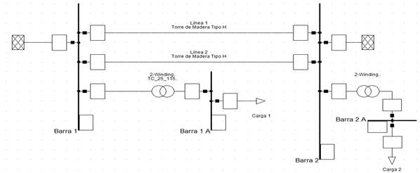 En el modelo se han tenido en cuenta los datos reales de cada uno de los elementos mostrados. A través de la herramienta Network Reduction del propio software DIgSILENT y teniendo toda la modelación del SEN de Cuba, se obtuvieron del modelo actual los valores de potencia de cortocircuito en cada uno de los sistemas equivalentes (en las condiciones de mayor generación). También se obtuvo a través de esta reducción los valores de resistencia, reactancia y susceptancia en ambos puntos de interconexión. Además, las líneas de transmisión han sido modeladas con la geometría de torre que más se repite, así como también se han modelado los conductores reales. Se modelaron en esta investigación cortocircuitos a lo largo de la línea 2 que une la barra 1 y barra 2, para analizar el comportamiento de la impedancia medida por los relés de distancia en la línea paralela no fallada (línea 1) una vez se despeje el cortocircuito.