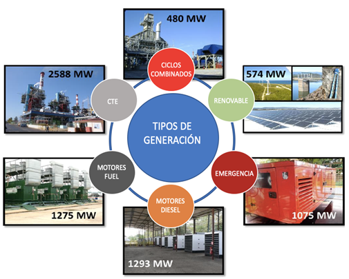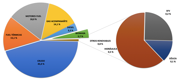 Otra característica es, la producción de más del 95% de la energía (eléctrica) con combustibles fósiles, a partir de una capacidad total de producción de energía instalada, estructurada por una combinación de carga base con centrales térmicas y cogeneración en la industria, generación descentralizada de energía con gas oil y fuel oil, bioenergía a partir del bagazo de la caña de azúcar y pequeñas cantidades de energía procedente de fuentes de biogás, hidroeléctricas, así como parques solares y eólicos, [7], (figura 1).