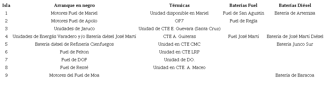 De acuerdo a lo ya referido, se ha adoptado la estrategia de construcción de islas. Cada isla tendrá como núcleo una unidad o emplazamiento de generación distribuida con arranque en negro y una unidad térmica disponible como composición mínima. Además, se podrán conectar otras unidades disponibles si son necesarias y no se pone en riesgo la estabilidad de la isla. El Despacho Nacional luego debe informar a los Despachos Provinciales y a las Centrales Térmicas, las unidades y emplazamientos que se utilizarán en la conformación de las islas, así como las cargas prioritarias y de control que serán reconectadas.