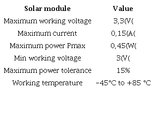 Since the aim of this study is to reduce the size and maintain the performance, a small solar panel containing polycrystalline coated solar cells protected by a solid outer frame was used, which has the characteristics mentioned in table 1.